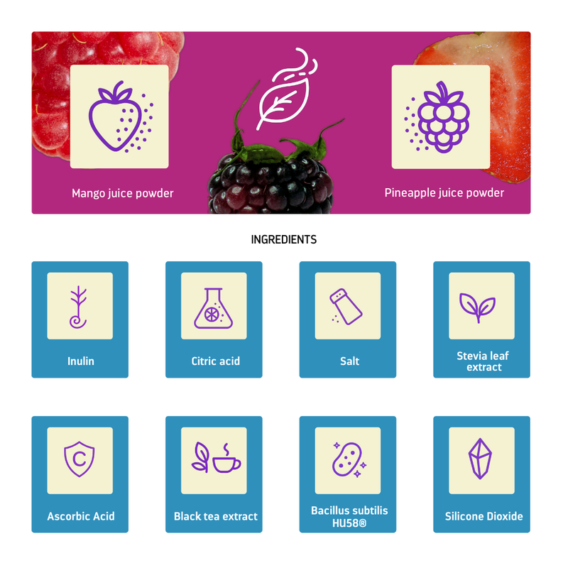 In each stick pack there is 1 billion CFU of Bacillus subtilis HU58®, a probiotic strain that is known to support the body’s immune response by reducing inflammatory markers.
